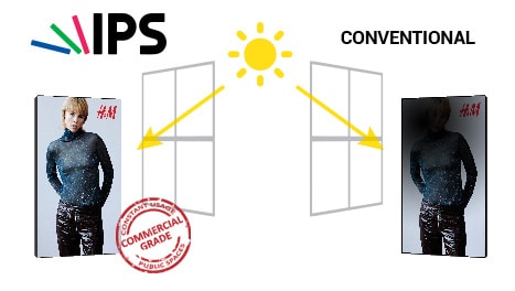 | IPS Commercial Grade Panel Superior colour uniformity, viewing angle and remarkably vibrancy, even when mounted in portrait. Also these panels do not suffer from blackening defect when used as a window display. |